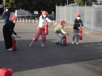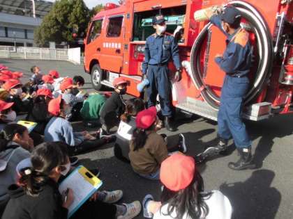 消防車のつくりについてしっかり話を聞いています。消火器の扱い方が分かり自信をもって取り組みました。お忙しい中、子どもたちの学習のためにお時間をつくっていただいた職員の皆様本当にありがとうございました。