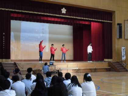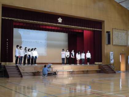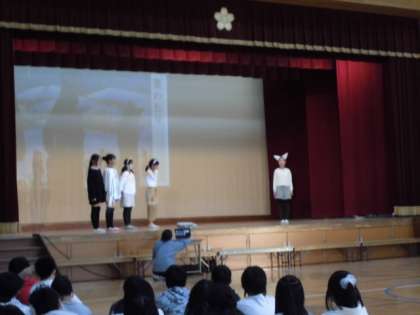 無事、発表を終えることができました。体育館に入る前からとても緊張した様子がみられましたが、練習の時より声も出ていて堂々と話したり演じたりすることができました。今回の内容は、これまでに学習した中での6年生自身の感想やふり返りなどをつないで構成しました。また、自分たちで考えて動きをつけたり、小道具を作ったりと進んで取り組むことができました。宮沢賢治の物語の世界に少しでも多くの方が興味をもってもらえたら嬉しいです。頑張りましたね!