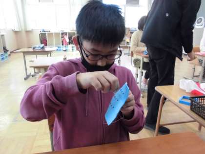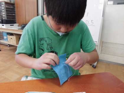 家庭科「ひと針に心をこめて」の学習で、針に糸を通す・玉結び・波縫い・球どめに取り組みました。