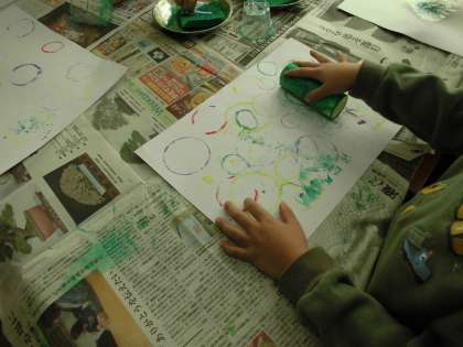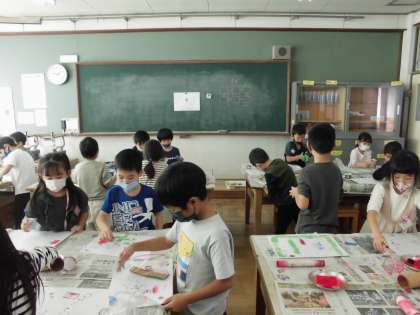 1125 1年生 図工 公開日 2022/11/25 更新日 2022/11/25 1年生 「ぺったんコロコロ」の学習をしました。 トイレットペーパーの芯や緩衝材など、身の回りにある物を使って、絵の具でスタンピングしました。 「すごい!」「きれい!」「おもしろいかたち!」とおもいおもいに感想を言う子どもたち。 色々な形と出会うことができました。 初めての図工室での活動でしたが、お話をよく聞いて充実した時間となりました。