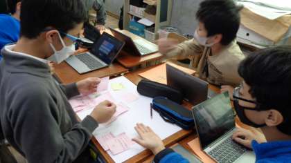 淀の町に必要な対策は?自分たちにできる取り組みは?学校のみんなや家族、地域の人に知らせたいことは?など、今、本当に必要なことは何なのかを考えながら防災プランを作っていきます。毎時間グループで話し合いを進めています。