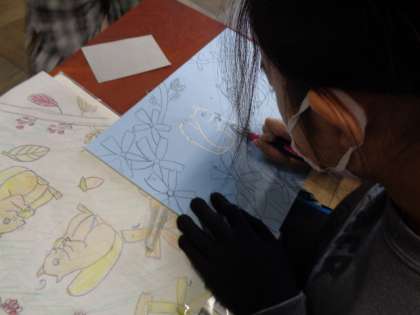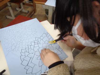 彫刻刀の使い方を確認し、安全にほり進めているところです。