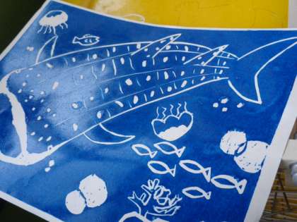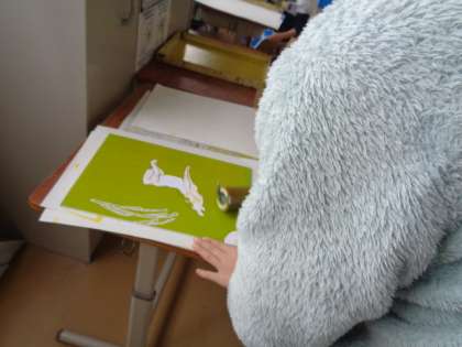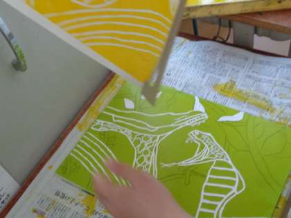 白く残したい部分を彫り、1色目を刷り始めました。