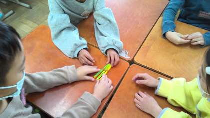 1216 1年生 算数 公開日 2022/12/16 更新日 2022/12/16 1年生 「大きいかず」の学習が始まりました。 今日はたくさんの数え棒を、どのように並べると数えやすいかを考えました。 「2ずつかな?」「2ずつだったら結構大変じゃない?」と口々に言う子どもたち。 いろいろ話し合った結果、「10のまとまりだと結構見やすいかも。」ということになり、実際に数え棒を10のまとまりごとにまとめ数えました。