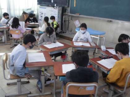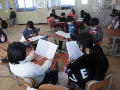 「始まり」「事件が起こる」「事件が解決する」「むすび」の組み立てを考えて一人ひとりが作った物語を友だちと読み合いました。同じ宝島の地図をもとにしていても各自が想像したことは様々で、友だちの内容の面白いところをふり返りに書くことができました。