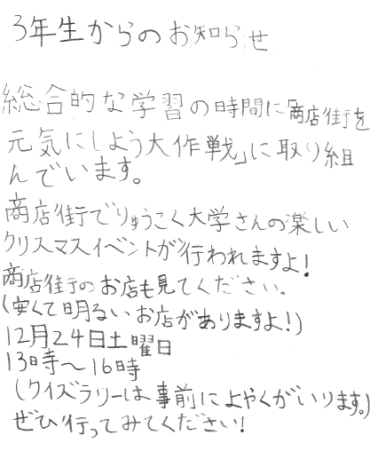 ぜひ皆様、3年生の子どもたちからのお知らせをお読み頂き、イベントへのご参加をお願いします。