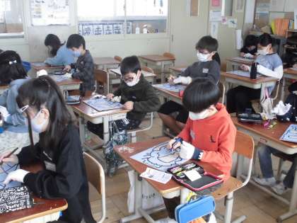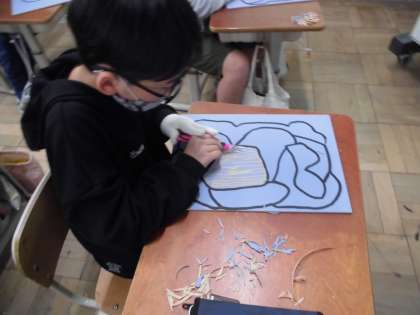 1223 4年 「ほってすって見つけて」 公開日 2022/12/23 更新日 2022/12/23 4年生 初めて手にする彫刻刀に挑戦です。安全な持ち方や彫り方を確かめながら、慎重に集中しながら彫っていました。彫ってみると、子どもたちから歓声がわーっと上がり、感激した様子でした。 彫刻刀に慣れながら、思い思いの模様を彫っていきたいと思います。どんな模様が彫れるのか楽しみです。