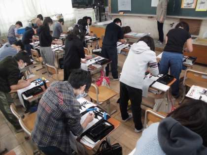 1223 4年 書写 書初め「美しい空」 公開日 2022/12/23 更新日 2022/12/23 4年生 画仙紙に「美しい空」と一筆入魂で書きました。文字のバランスが難しいようで、一文字書き終わるごとに、「ふうー」と深い息をついていました。気持ちがこもった素敵な書き初めになりました。来年もよい年でありますように。