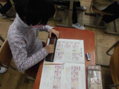 今日は、全国珠算教育連盟から講師の先生に来ていただき、そろばんの学習をしました。そろばんの歴史や電卓やコンピューターとは違う良さについて教えていただいた後、珠の入れ方やはじき方、定位点からの位の仕組みなど基本を学習しました。2時間後には,簡単な計算ができるようになり、その便利さを感じた子からは、「すごい」と声が聞かれました。