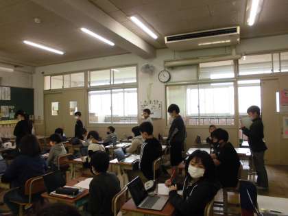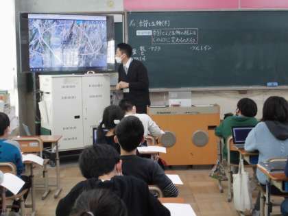1年間、季節の移り変わりと共に観察を続けて生きている「ツルレイシ」と「サクラ」です。タブレットで写真を撮り、秋と比べて観察した植物が、どのように変わったかを話し合いました。
