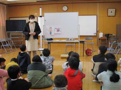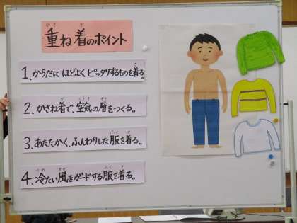身体計測の前には暖かい服の着方についてのお話を聞きました。下着を着ることで空気の層を作ること、上着には風を通さないものを着るなどの工夫について学びました。これからまだまだ寒い日が続きます。衣服の工夫もして、風邪や感染症の予防をしましょう。