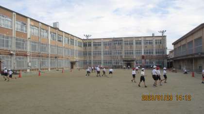 サッカーの学習の様子です。 チームで作戦を考え、声を掛け合いながら、ゲームを進めていました。