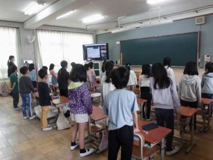 今日は令和4年度の修了式です。各教室でオンラインで行いました。校歌を元気に歌っています。
