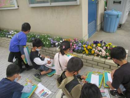 0414 2年生 お花見スケッチ 公開日 2023/04/14 更新日 2023/04/14 2年生 図工の学習で、校内に咲いている花をかきました。 桜は散ってしまいましたがパンジー等さまざまな花が咲いているのを見て 「春だなー。」とつぶやきながら思い思いにかいていました。