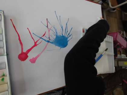 いろいろな絵の具の塗り方を工夫し、試して楽しみました。水の量を変えたり、色の混ぜ方を工夫したり、筆づかいを工夫したりしました。また、新たな技法としてストローで絵の具を吹いて描く方法にも挑戦しました。