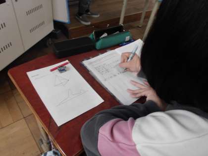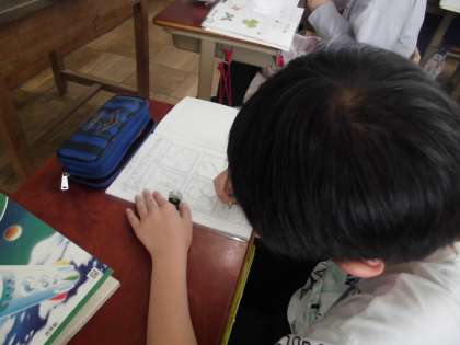 対称な図形の学習です。形に目をつけて仲間分けをしました。折り目の両側がぴったり重なる図形は「線対称である」ということを学習しました。線対称な図形の性質を考え、線対称な図形をかく練習をしています。