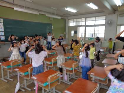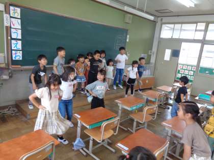 みんなノリノリで、「チェッチェコリ」を踊りました。黒板の前に立って踊りを先導してくれる子どもたちと、後から踊りをまねっこして踊る子どもたちに分かれて踊りました。みんなとってもニコニコ笑顔で踊りました。大盛り上がりです。