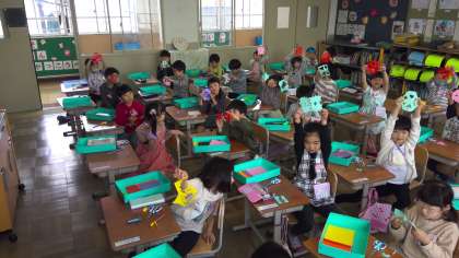 切り込みの形や折り紙の折り方を変えて、自分だけのかざりを作りました。