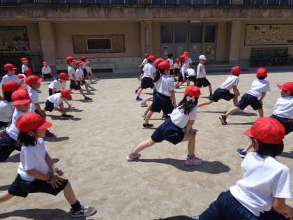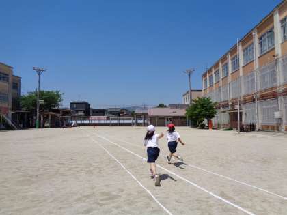 「位置について、用意、どん」と赤い旗を見て、スタートをしました。