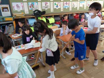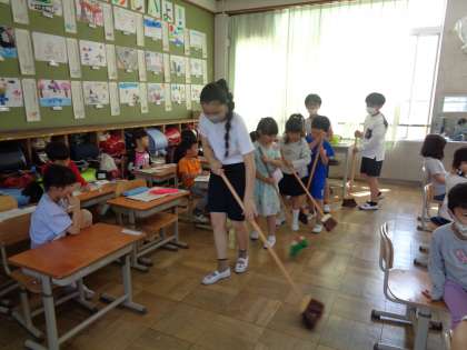 6年生のお兄さんお姉さんにほうきの持ち方を教えてもらい、今日は教室を掃くことを教えてもらいました。