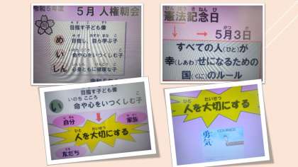 5月は憲法月間です。最初に、3日は憲法記念日でみんなの幸せを守るために憲法があることを話しました。そして同じように学校にもルールがあることも。