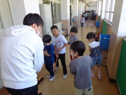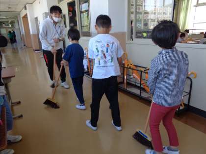 廊下の掃き掃除を頑張っていました。箒で掃く方向を確かめながら、丁寧に掃除をしています。みんなで掃除をして、廊下はピカピカです。