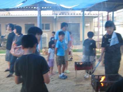 テントを張った後は,運動場で焼きそばを作りました。火をおこすのが難しくて木のくべ方を変えてみたり,風の向きを考えてコンロを置いたりなどしていました。苦労して火をおこして,みんなで協力して作った焼きそばはとても美味しかったです。子どもたちはお腹いっぱい食べました。
