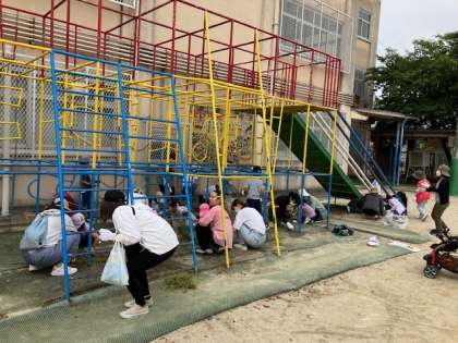 遊具の下の草を引いたり、