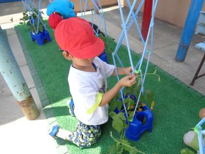 水やりをして帰ってきたある子どもが、「先生、アサガオのツルとツルがねじねじからまってるー!!」と慌てて報告しに来てくれました。