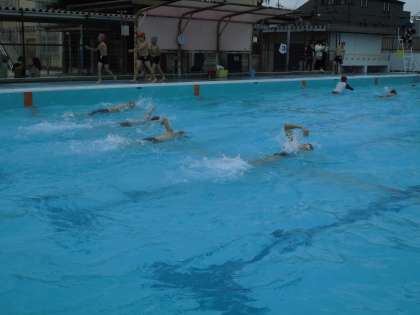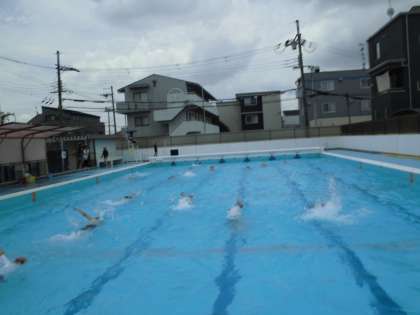 水泳学習がんばっています。姿勢や、手のかき、バタ足、息つぎなど、気をつけるポイントを一人ひとり意識しながら、すこしでも長い距離およげるように、きれいに泳げるように練習しています。