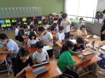横で、やさしく見守ってくれている6年生がいて、1年生は安心してGIGA端末を扱うことができたようです。