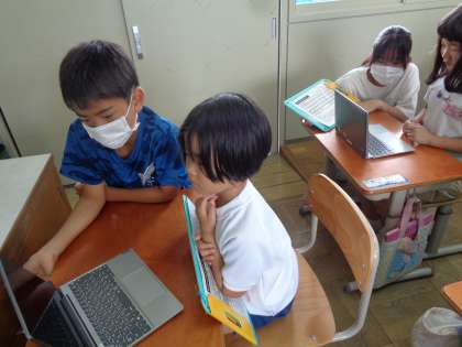 6年生にGIGA端末の使い方を教えてもらった1年生は、一人で電源を入れることやIDとパスワード入れること、シャットダウンすることができるようになりました。