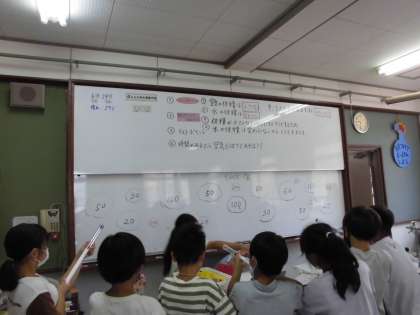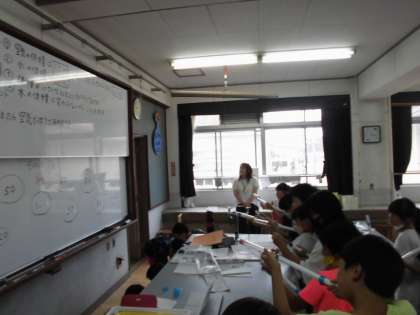 理科でとじこめた空気と水の学習をしました。筒に空気や水をとじこめ、それらを押すと手ごたえや体積はどうなるかを実験しました。この日は全て学習が終わったので、空気でっぽうで遊びました。ホワイトボードの的をねらって玉をとばしました。より高得点の的に当てられるよう、みんな一生懸命でした。