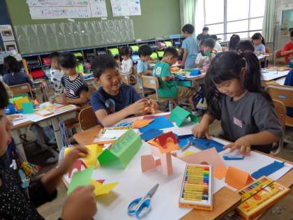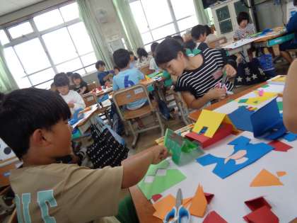 図工の学習で色画用紙を使って折って、思い浮かんだものを作りました。