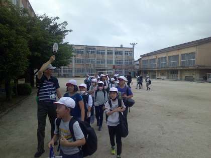 出発式も終わり、バスのところまで。立ち上がって、学校を出るこの瞬間・・・。いよいよ本当に行くんだなという実感が一気にこみあげてきます。写真には写っていませんが、多くの教職員や在校生が5年生を見送ってくれました(もっと写真の撮り方を勉強します・・・)。ありがとう在校生、ありがとう先生たち。僕たち・わたしたちの帰りを楽しみに待っていてね!