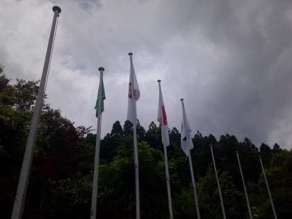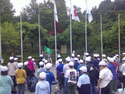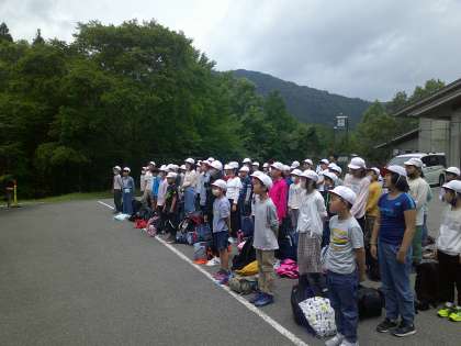 5年 花背山の家 『入所式 話を聞く態度が素晴らしい 編』 公開日 2023/07/10 更新日 2023/07/10 5年生 11時前、予定通り花背山の家に到着しました。曇り空ですが、雨は降っていません。市内よりは気温が1〜2度低いでしょうか。湿度が高いので、蒸し暑い感じです。バスの中でも体調を崩す子はいませんでした。よかったです。校歌とともに空高く舞い上がる校旗。誇らしいです。そして何よりも職員さんの話を聞く5年生の態度。本当に本当に素晴らしかったです。