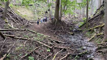 5年 花背山の家 『登山 ヒーロー達の帰還 6 編』 公開日 2023/07/11 更新日 2023/07/11 5年生 蒸し暑かったせいもあり、お茶の減りが思いのほか早かったようです。そのことも見越して、同行した教職員は、リュックに2リットルのお茶や水のペットボトルを1〜2本背負って登ってくれました。重たかったと思います。身内が身内を褒めるのもなんですが、よくやってくれました。