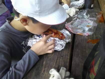 それにしても朝から大忙しです。9時には部屋を出なければなりません。荷物整理に部屋の清掃、もちろんパックドックの後片付けも。このあとは、冒険の森で遊んで、また野外炊事に戻ってすき焼き風煮づくり。火や食器を使うので野外炊事場の後片付けも大変です。退所式に間に合うのか・・・?やるしかない。今日のめあては『協力』。ぴったりですね!