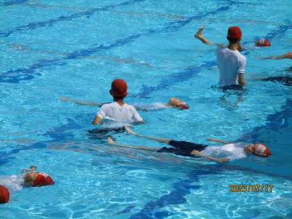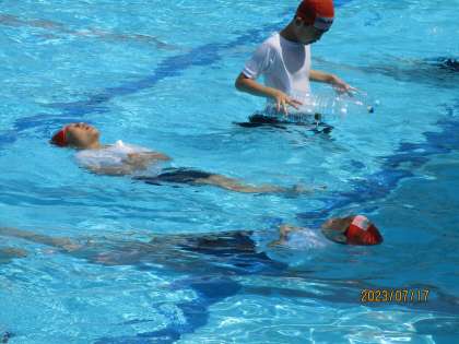 万が一の時には、泳ぐことよりも仰向けに浮かぶことの大切さを知り、服に上手に空気を入れて浮かんだり、道具(今回はペットボトル)を使って浮かんだりの体験をしました。