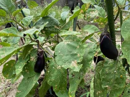 猛暑が続いていますが、ナスやピーマン、ミニトマトは、元気に実をつけています。