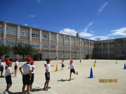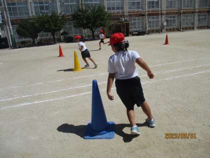 0901 2年生 リレーあそび 公開日 2023/09/07 更新日 2023/09/07 2年生 青空の下、リレー遊びを楽しんでいます。 ただすごく暑いので、日陰で休んだりこまめに水分補給をしたりしながら 進めています。 コーンのまわりは小さく回りたいですね。