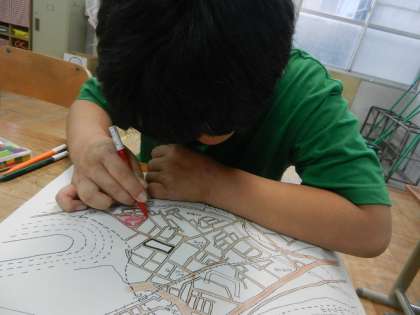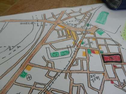 iPadで画像を見ながら、白地図にいろいろな施設を色分けして書き込んでいきました。