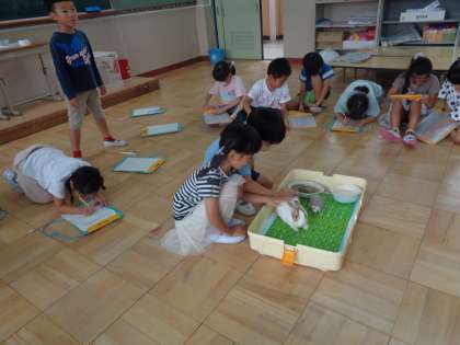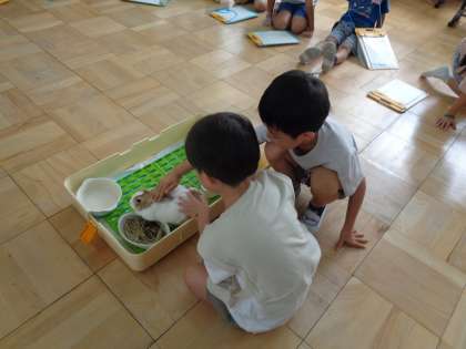 学校で飼育しているウサギの「ミルク」と一緒に学習をしました。