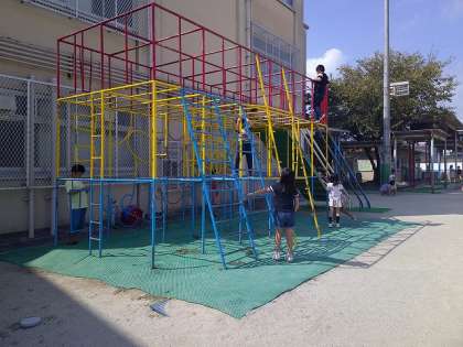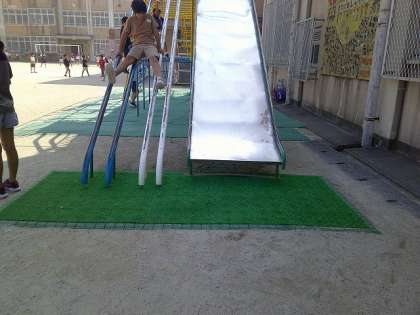 お知らせが遅くなりましたが、PTAにご支援いただき、夏休みに遊具(チャレンジャー)の安全マットを新しいものに取替えました。