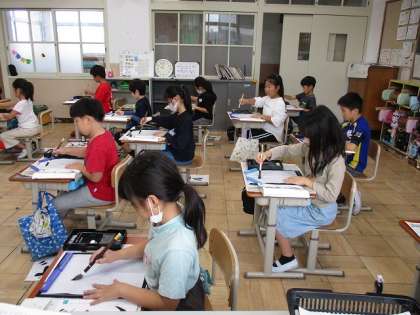1221 ★3年生 習字をしたよ 公開日 2023/12/22 更新日 2023/12/22 3年生 習字の時は一筆、一筆先生と一緒にゆっり書いています。 お正月に向けての書き初めをしたり、 本物の墨をすって、来年の干支の龍(辰)という字を書きました。