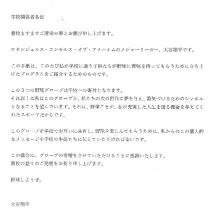 0118 大谷選手からのグローブが届きました 公開日 2024/01/18 更新日 2024/01/18 学校のようす 昨日、明親小学校にもメジャーリーガー大谷選手からのグローブが届きました。 今後、子どもたちが手にする機会を作りたいと思います。 子どもの頃から夢を追い続け、今なお挑戦し続けている大谷選手。 その思いも明親小学校の子どもたちに届くといいなと思います。