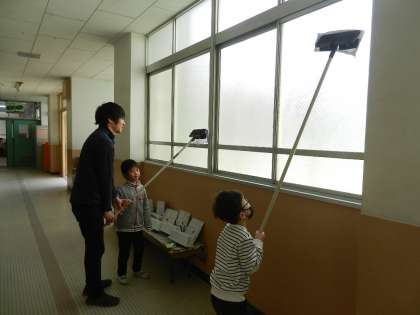 廊下の窓は、長いモップの先にぞうきんをつけて拭きます。
