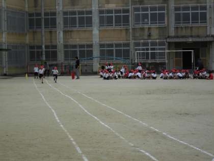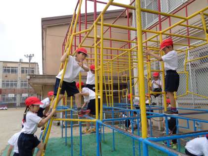 体育の服に着替えることも上手にできる1年生。先週は遊具遊び、今日は50m走をしました。保育園や幼稚園とは違う大きな遊具にはじめはこわごわでしたが、だんだん上手にのぼれるようになってきました。遊具の下で迷路をして楽しんでいた人もいましたよ。50m走は友達と一緒に「よーいドン!」ゴールを目指して一生懸命走りました。これからもたくさん体を動かしていきましょう。