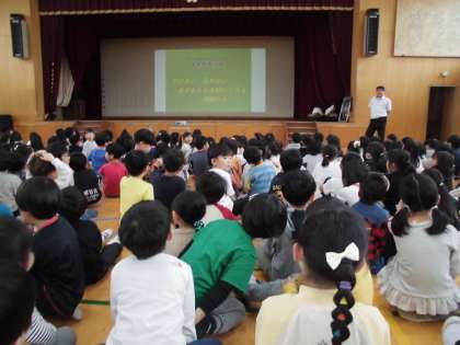 今日は人権朝会でした。1年生にとっては全校で集まる初めての機会でした。校長先生から明親小学校が164歳ということを教えてもらいびっくりした様子でした。また『とんでもない』という絵本の読み聞かせをしてもらいました。
