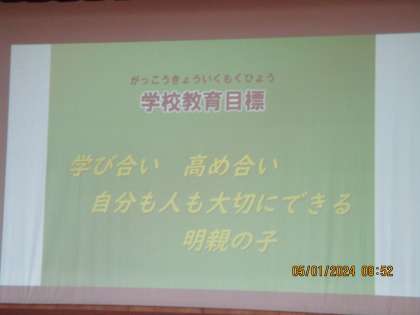 人権朝会では、初めに明親小学校が164歳(164年目)であり、卒業生は1万人を超える歴史のある素晴らしい学校であるということを伝えました。次に今年度新しくした学校教育目標も日本国憲法も、自分や人を大切にするという中身は同じであること、一人一人みんな違うけれど誰もに良さがあり、大切な存在であることを伝えました。
